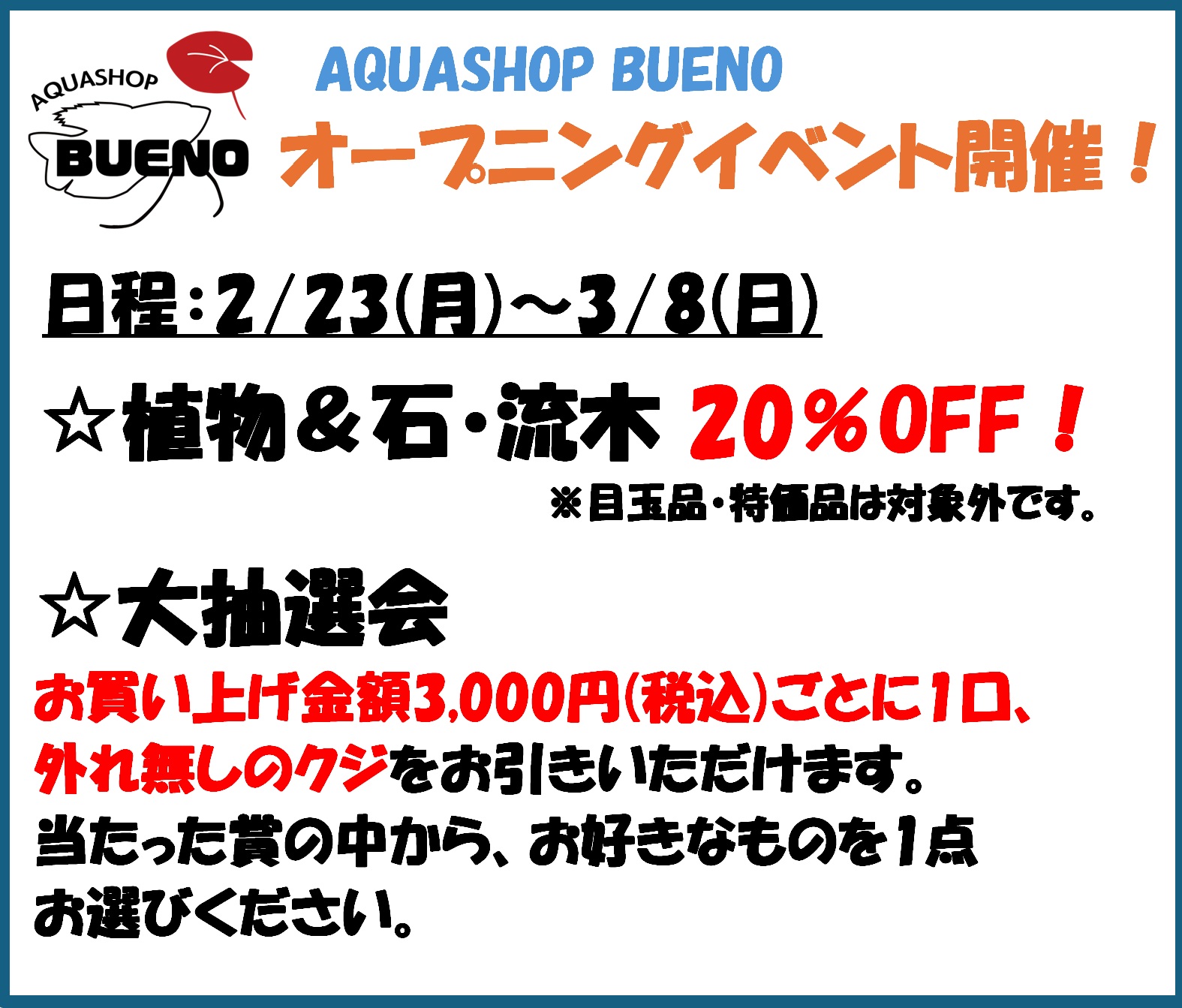 明日、2/23(月)はいよいよAQUASHOP BUENOのオープン日です!