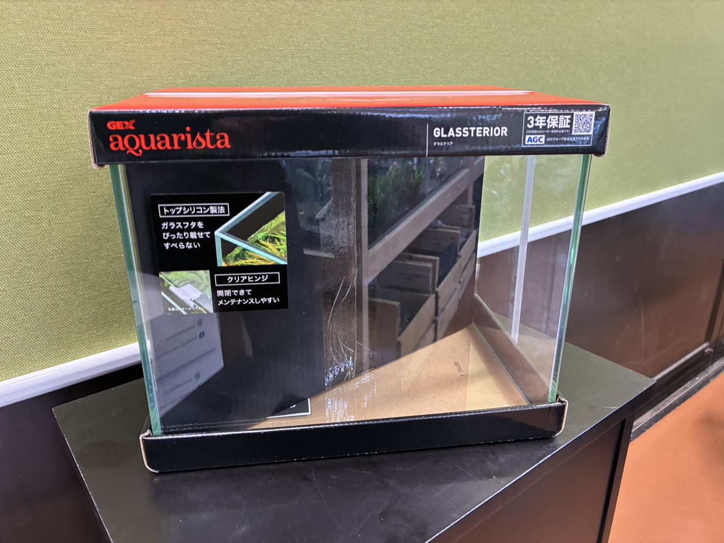 コトブキ工芸の新製品・バックが黒いスモークガラスになった水槽です。